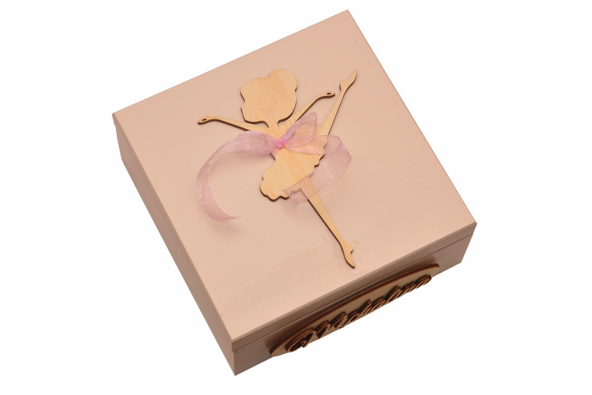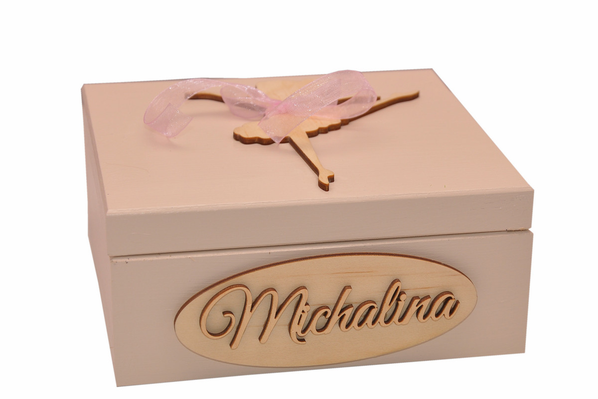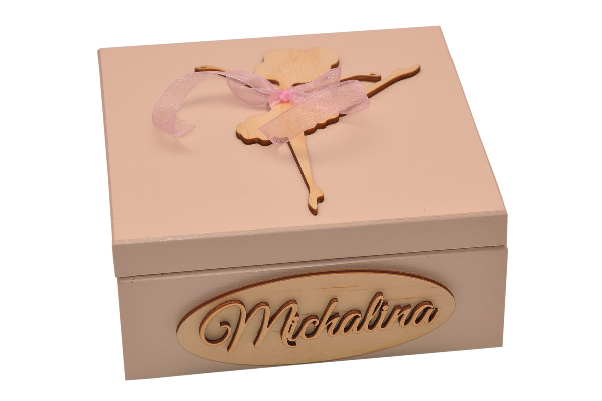Beżowe pudełko z baletnicą + imię, drewniane pudełko na prezent.