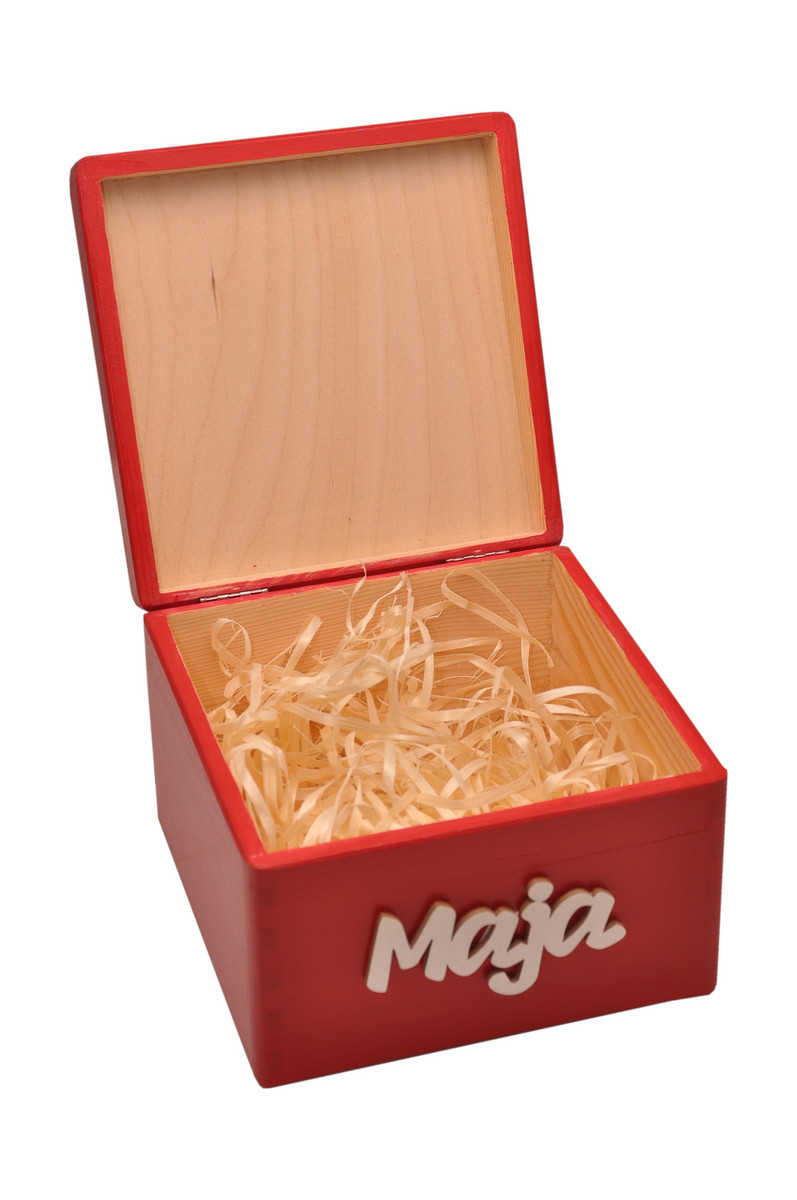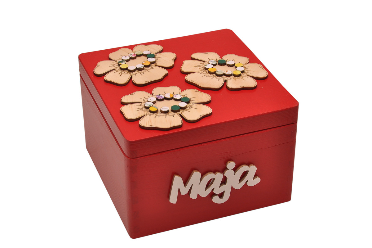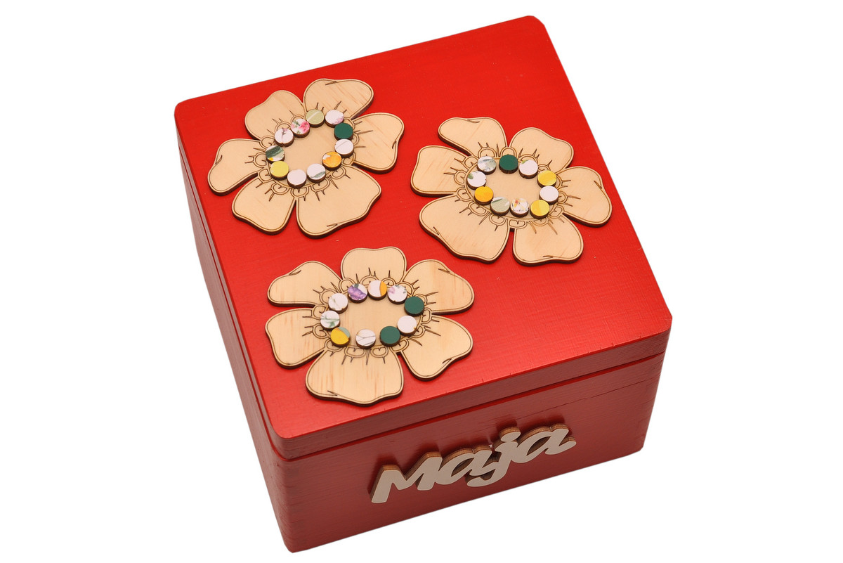 Czerwony kuferek z kwiatami + imię, drewniane pudełko na prezent.