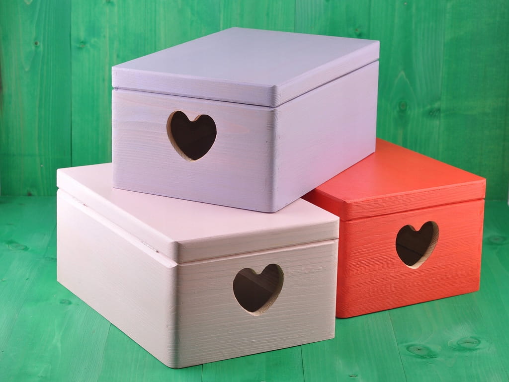 Kuferek malowany farbą akrylową z atestem i zabezpieczony lakierem akrylowym.