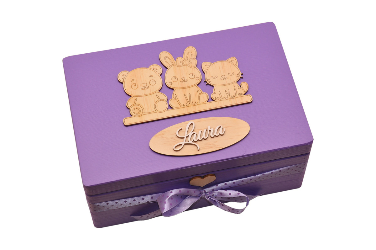 Na wieczku dekor wesołe zwierzątka + imię na podkładce wycinane ozdobna czcionka laserowo.