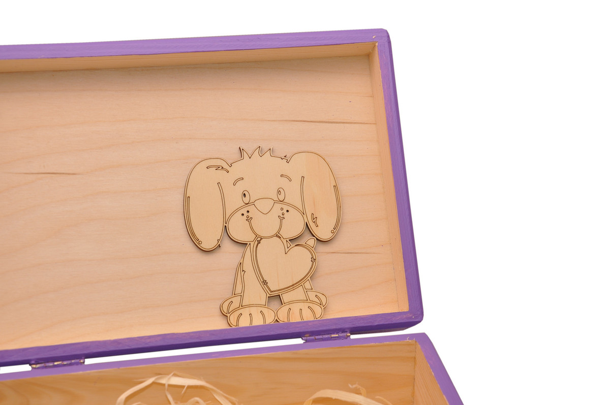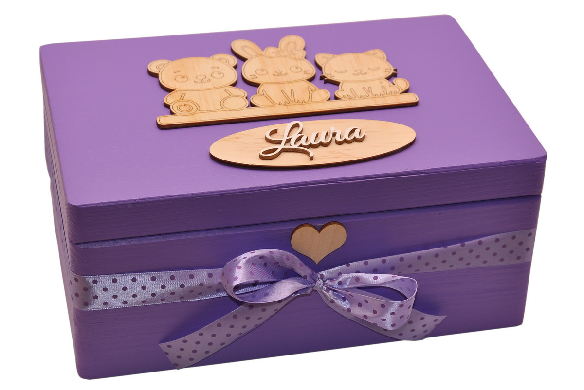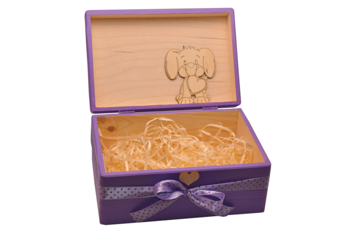 Fiołkowy kuferek z dekorami wesołe zwierzątka, drewniane pudełko na prezent.