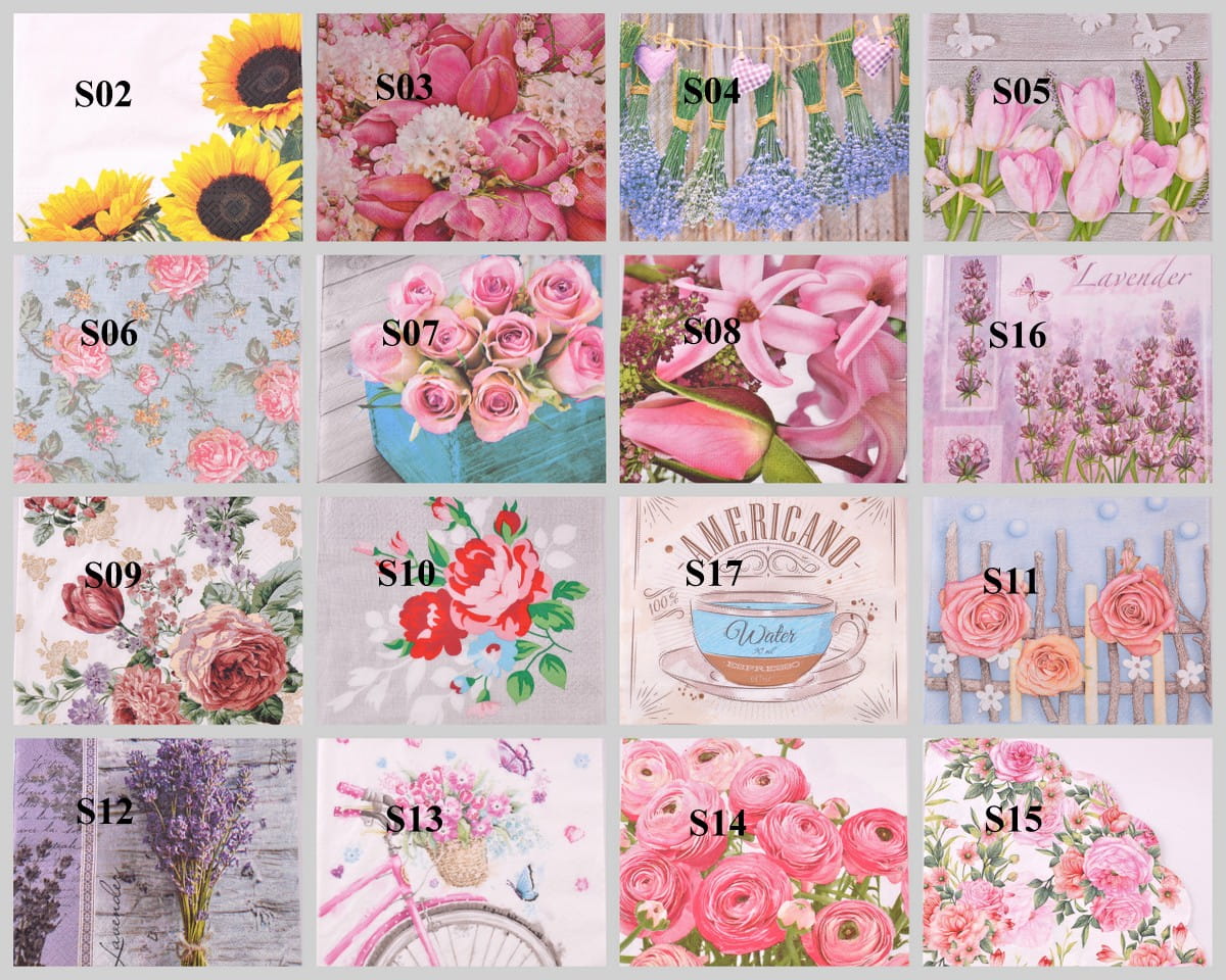 Serwetki dostępne w kilkunastu wzorach, kolorach, motywy np. florystyczne, romantyczne, okazjonalne (świąteczne).