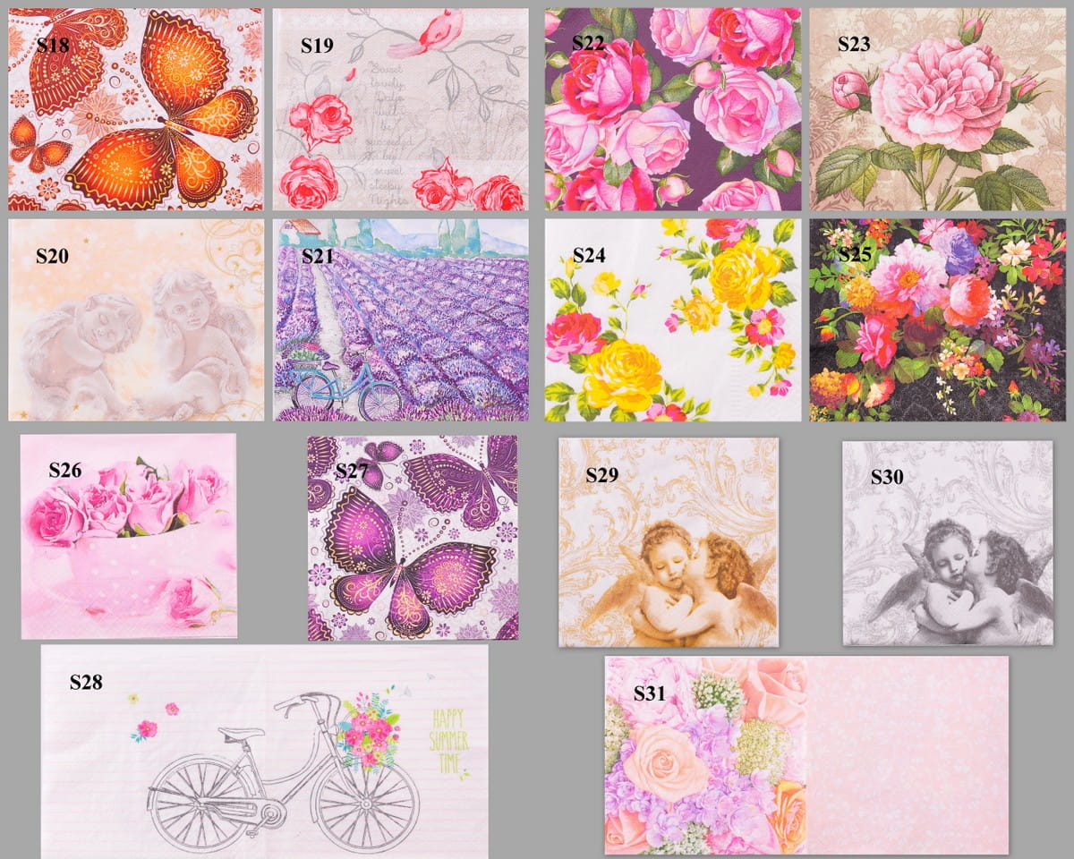 Serwetki dostępne w kilkunastu wzorach, kolorach, motywy np. florystyczne, romantyczne, okazjonalne (świąteczne).