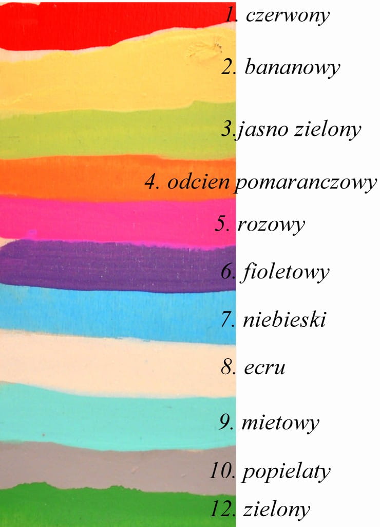 czerwony, bananowy, jasno zielony, odcień pomarańczowy, różowy, fioletowy, niebieski, ecru, miętowy, popielaty, zielony.